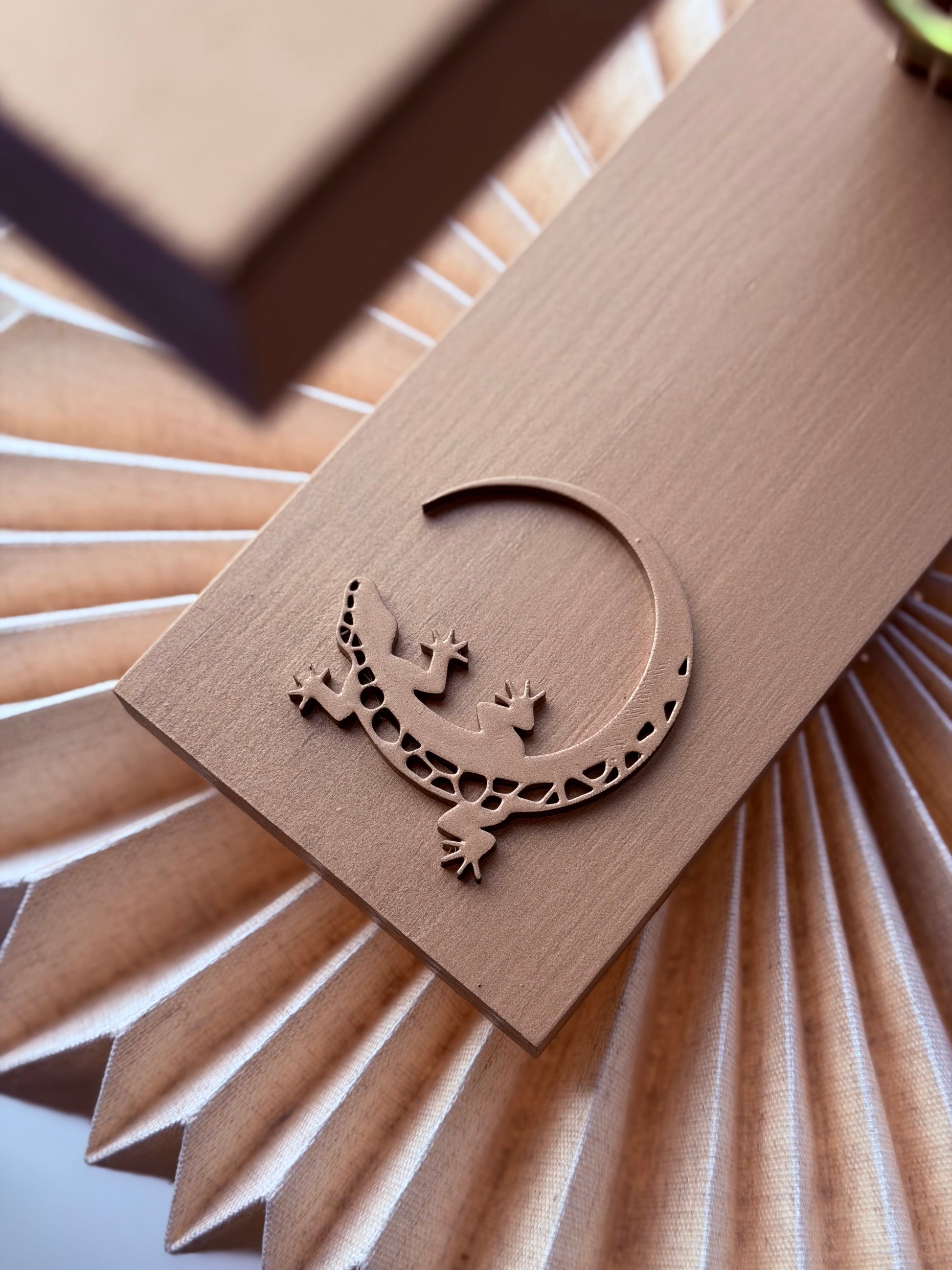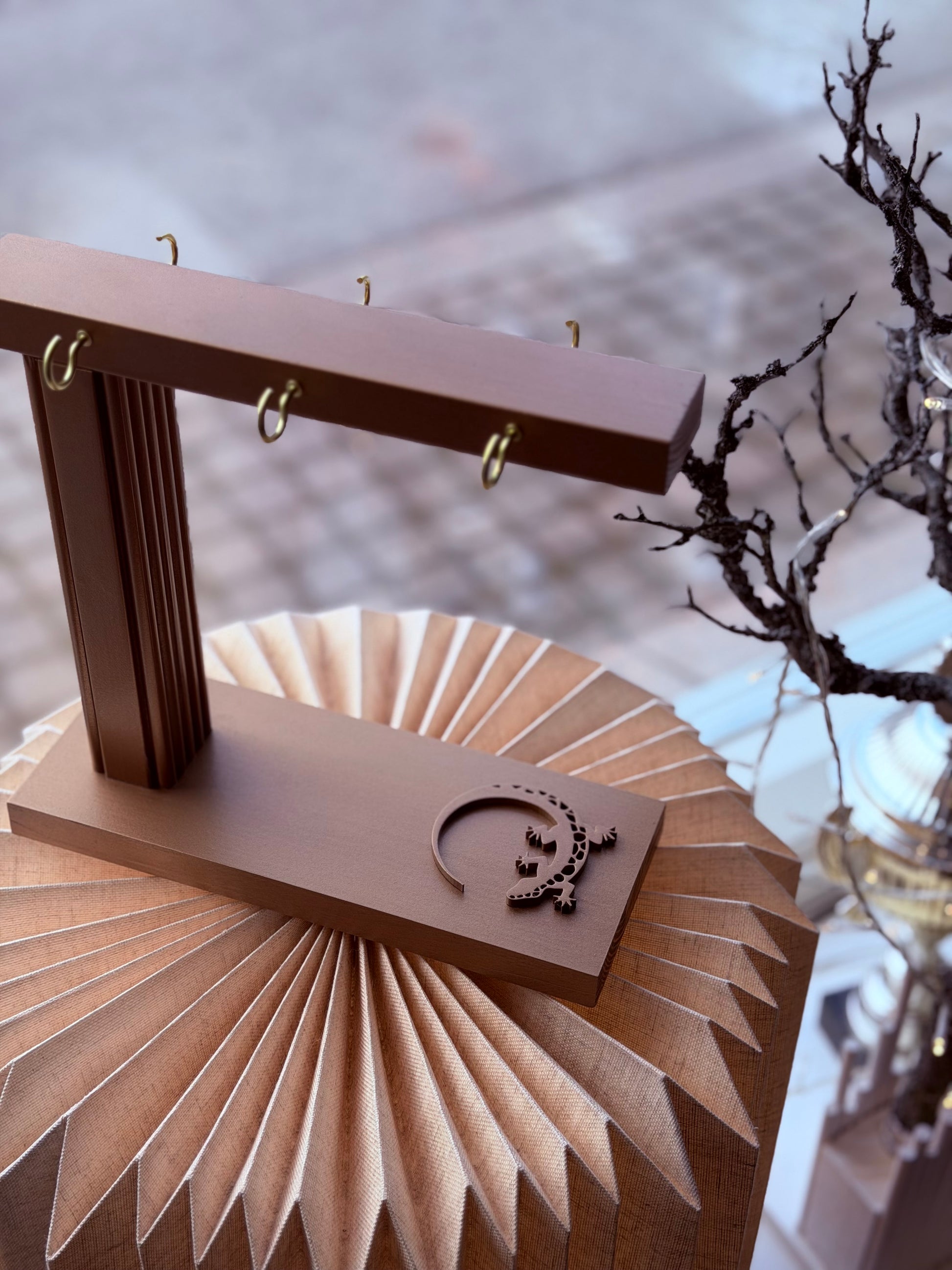 Puinen teline värimallien esittelyyn. Telineen on suunnitellut ja valmistanut Kaspar Ahtiainen.