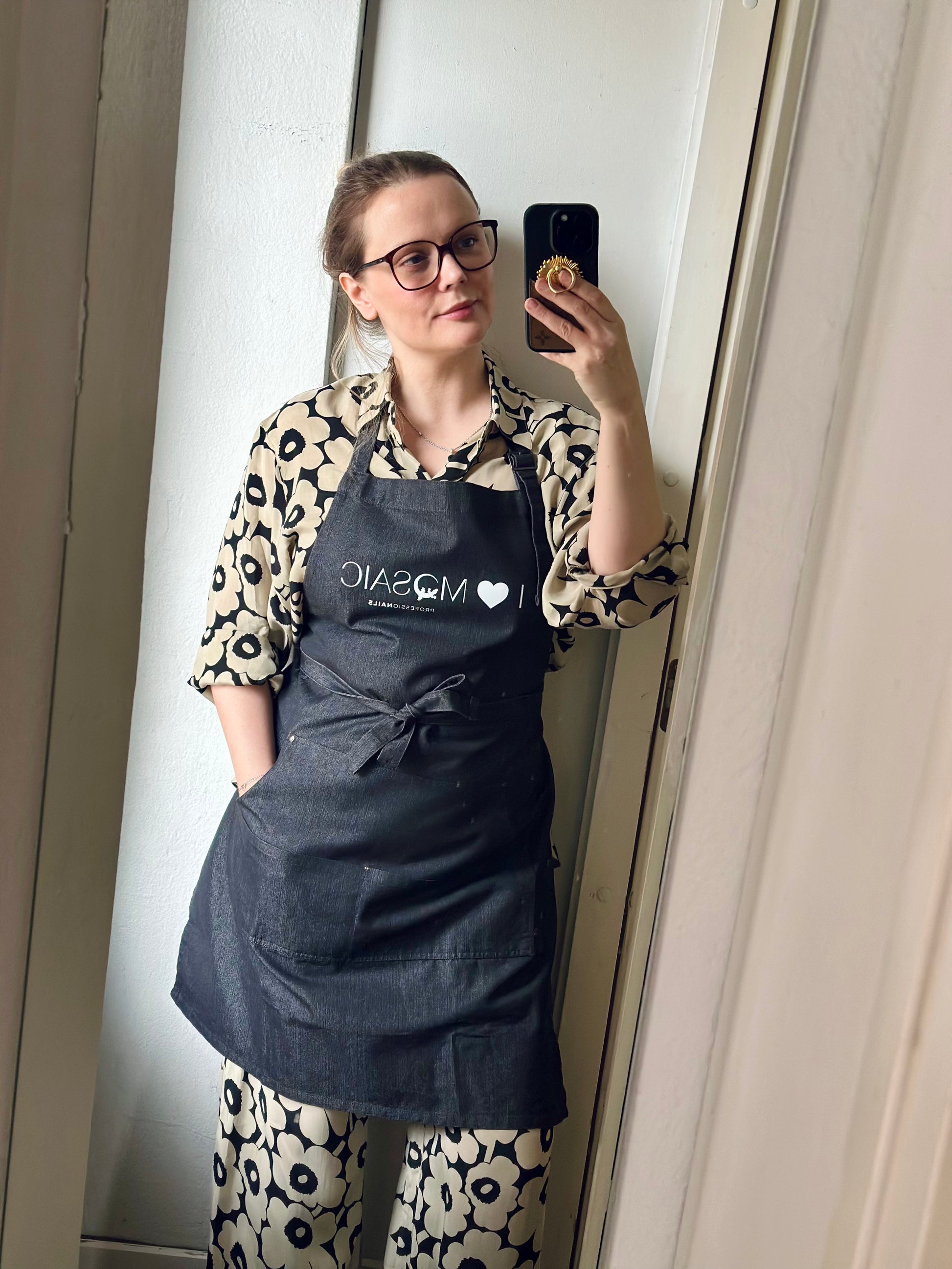Denim-kankainen essu, jossa farkkutyyliset taskut, farkkutikkaukset ja metalliniitit. Esiliinan logo on toteutettu upeana pronssisena.